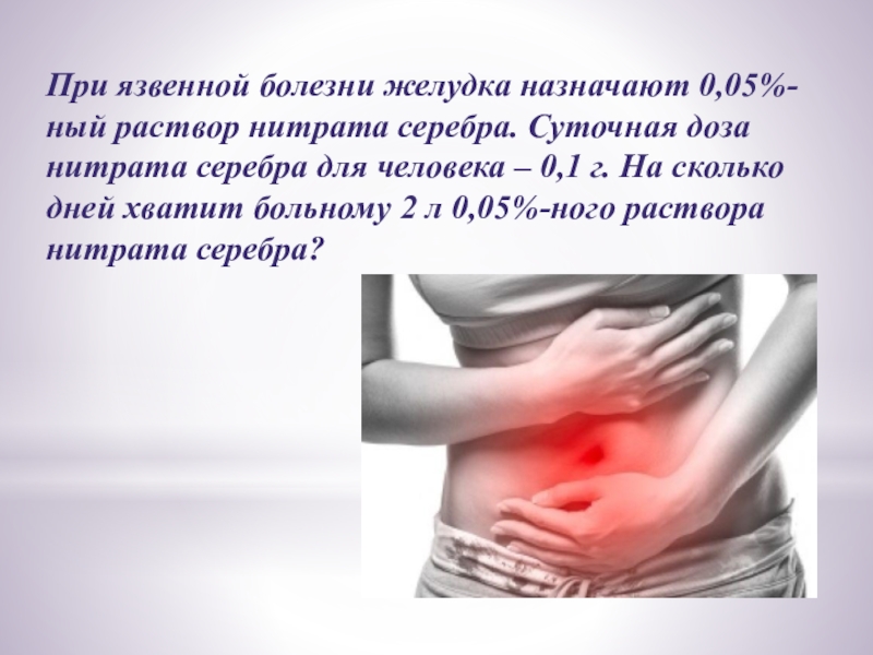 Слайд 22При язвенной болезни желудка назначают 0,05%-ный раствор нитрата серебра. Суточная доза