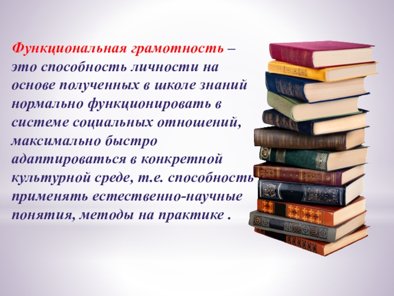 знаний нормально функционировать в системе социальных отношений, максимально быстро адаптироваться в конкретной культурной среде, т.е. способность применять естественно-научные понятия, методы на практике .