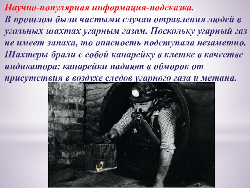 угарным газом. Поскольку угарный газ не имеет запаха, то опасность подступала незаметно. Шахтеры брали с собой канарейку в клетке в качестве индикатора: канарейки падают в обморок от присутствия в воздухе следов угарного газа и метана.