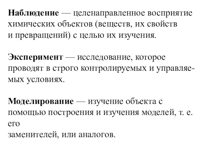 Наблюдение — целенаправленное восприятие химических объектов (веществ, их свойстви превращений) с целью их изучения.Эксперимент — исследование, которое проводят в строго контролируемых и управляе-мых условиях.Моделирование — изучение объекта с помощью построения и изучения моделей, т. е. егозаменителей,