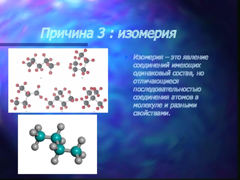 Причина 3 : изомерияИзомерия – это явление соединений имеющих одинаковый состав, но отличающиеся последовательностью соединения атомов в