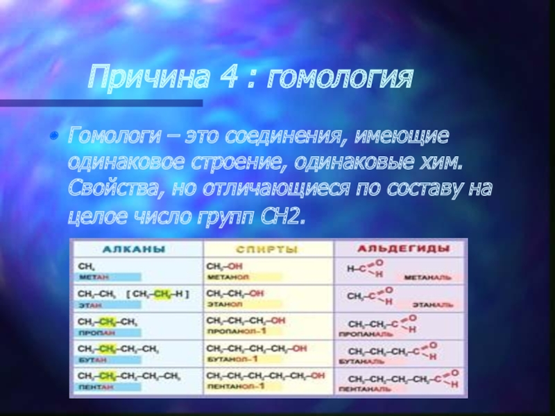 Причина 4 : гомологияГомологи – это соединения, имеющие одинаковое строение, одинаковые хим. Свойства, но отличающиеся по составу