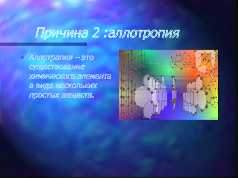 Причина 2 :аллотропияАллотропия – это существование химического элемента в виде нескольких простых веществ.