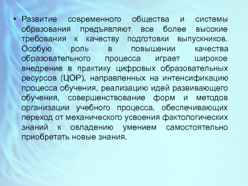 к качеству подготовки выпускников. Особую роль в повышении качества образовательного процесса играет широкое внедрение в практику цифровых образовательных ресурсов (ЦОР), направленных на интенсификацию процесса обучения, реализацию идей развивающего обучения, совершенствование форм и методов организации учебного процесса, обеспечивающих переход от механического усвоения фактологических знаний к овладению умением самостоятельно приобретать новые знания.