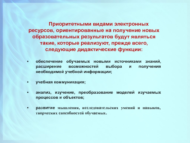 Слайд 5Приоритетными видами электронных ресурсов, ориентированные на получение новых образовательных результатов будут