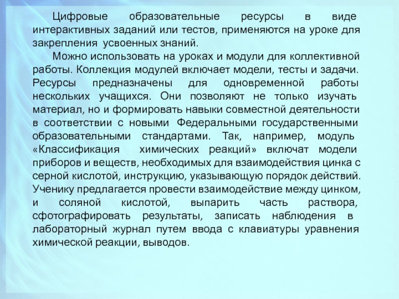 Можно использовать на уроках и модули для коллективной работы. Коллекция модулей включает модели, тесты и задачи. Ресурсы предназначены для одновременной работы нескольких учащихся. Они позволяют не только изучать материал, но и формировать навыки совместной деятельности в соответствии с новыми Федеральными государственными образовательными стандартами. Так, например, модуль «Классификация химических реакций» включат модели приборов и веществ, необходимых для взаимодействия цинка с серной кислотой, инструкцию, указывающую порядок действий. Ученику предлагается провести взаимодействие между цинком, и соляной кислотой, выпарить часть раствора, сфотографировать результаты, записать наблюдения в лабораторный журнал путем ввода с клавиатуры уравнения химической реакции, выводов.