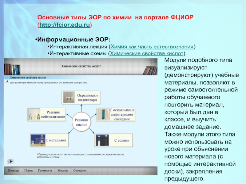 Слайд 11Основные типы ЭОР по химии на портале ФЦИОР (http://fcior.edu.ru)
