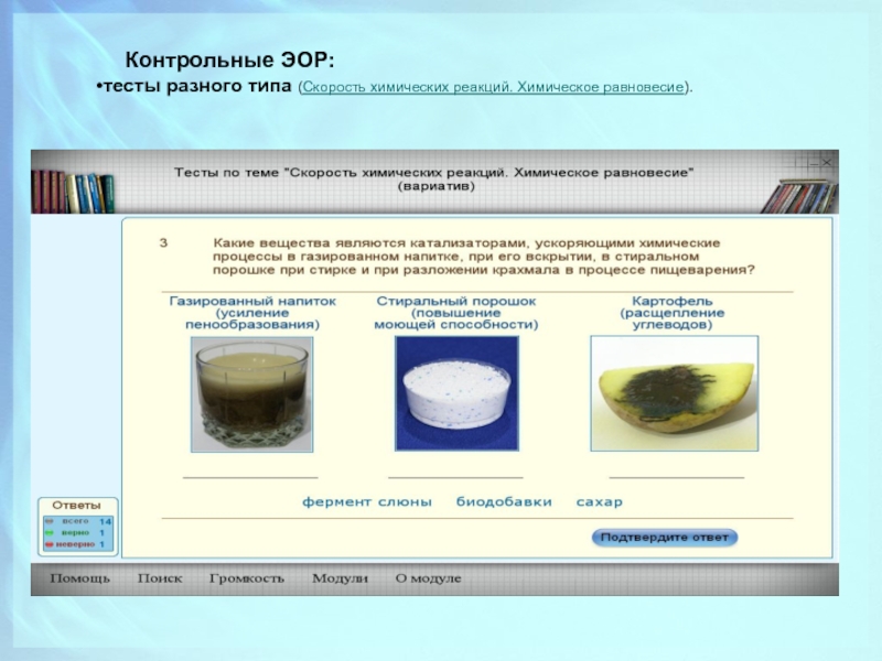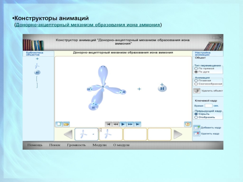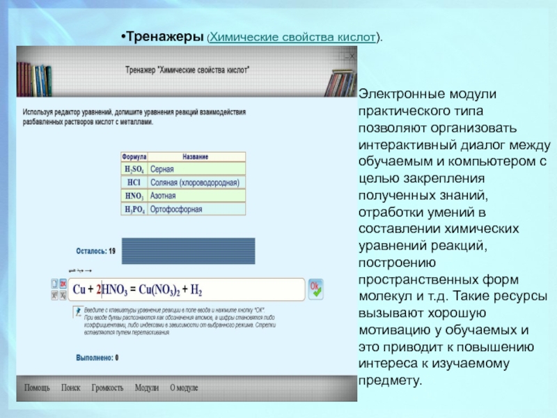 между обучаемым и компьютером с целью закрепления полученных знаний, отработки умений в составлении химических уравнений реакций, построению пространственных форм молекул и т.д. Такие ресурсы вызывают хорошую мотивацию у обучаемых и это приводит к повышению интереса к изучаемому предмету.