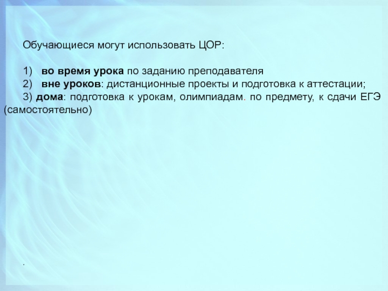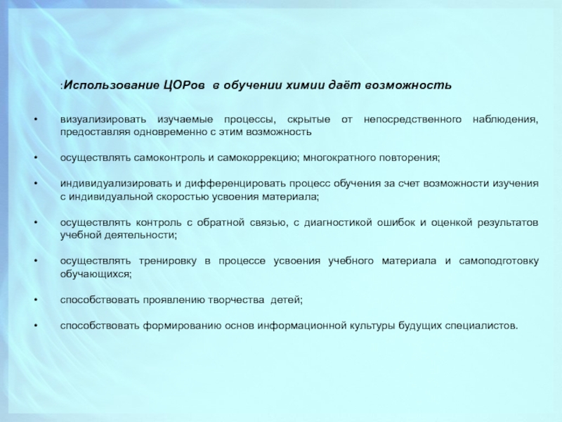 Использование ЦОР создает возможность доступа к современной актуальной информации, позволяет управлять познавательной деятельностью школьников, учитывать индивидуальные темпы усвоения знаний и умений, уровень сложности, интересы, повышать познавательную активность и мотивацию обучения школьников. ЦОР позволяют учителю работать с учеником дифференцированно и индивидуально, даёт возможность оперативно проконтролировать и оценить результаты обучения.