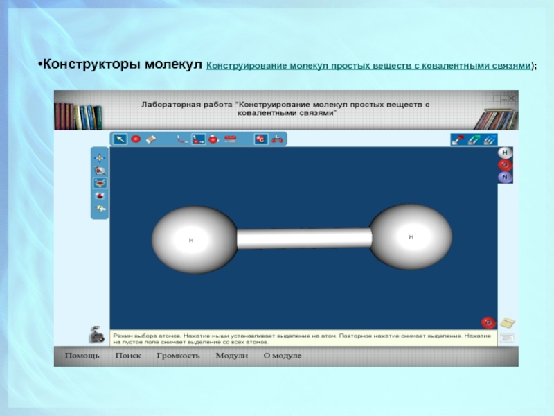 Слайд 13Конструкторы молекул Конструирование молекул простых веществ с ковалентными связями);