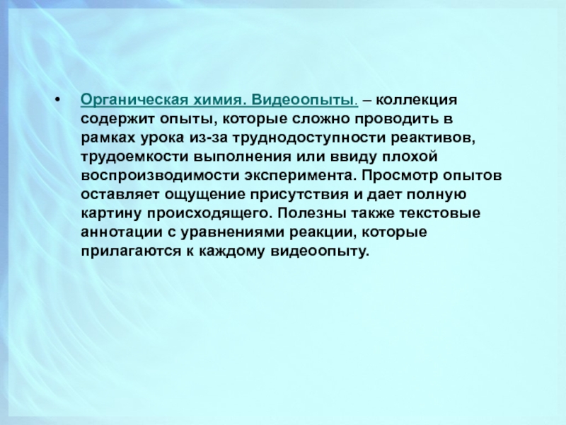 Слайд 24Органическая химия. Видеоопыты. – коллекция содержит опыты, которые сложно проводить в