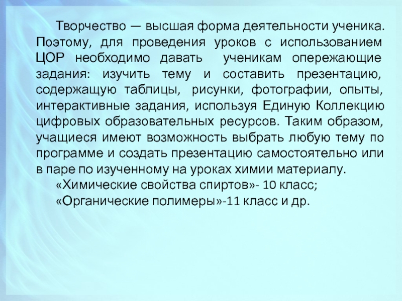 использованием ЦОР необходимо давать ученикам опережающие задания: изучить тему и составить презентацию, содержащую таблицы, рисунки, фотографии, опыты, интерактивные задания, используя Единую Коллекцию цифровых образовательных ресурсов. Таким образом, учащиеся имеют возможность выбрать любую тему по программе и создать презентацию самостоятельно или в паре по изученному на уроках химии материалу.