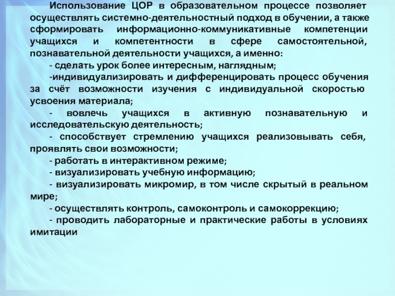 Слайд 27Использование ЦОР в образовательном процессе позволяет осуществлять системно-деятельностный подход в обучении,