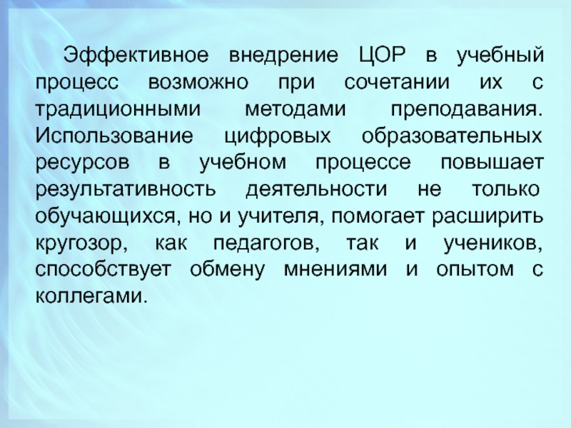 Эффективное внедрение ЦОР в учебный процесс возможно при сочетании их с