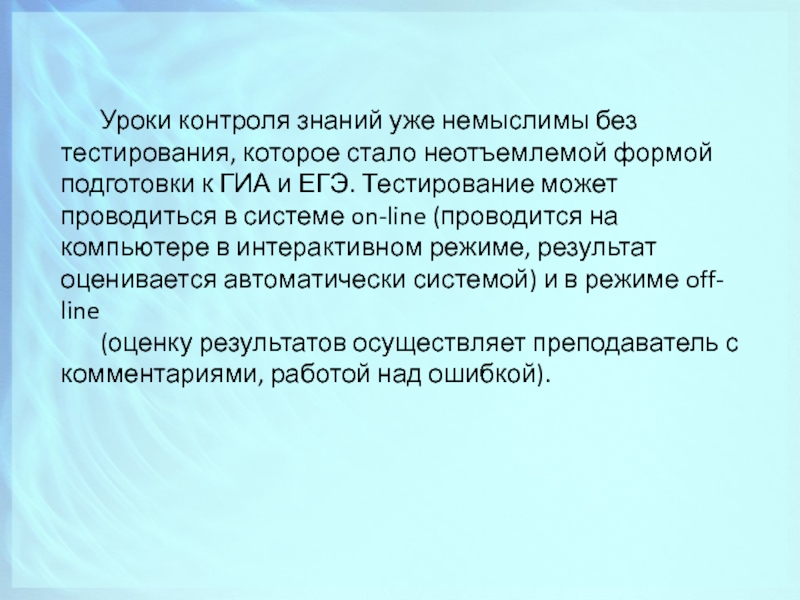 Слайд 20Уроки контроля знаний уже немыслимы без тестирования, которое стало неотъемлемой формой