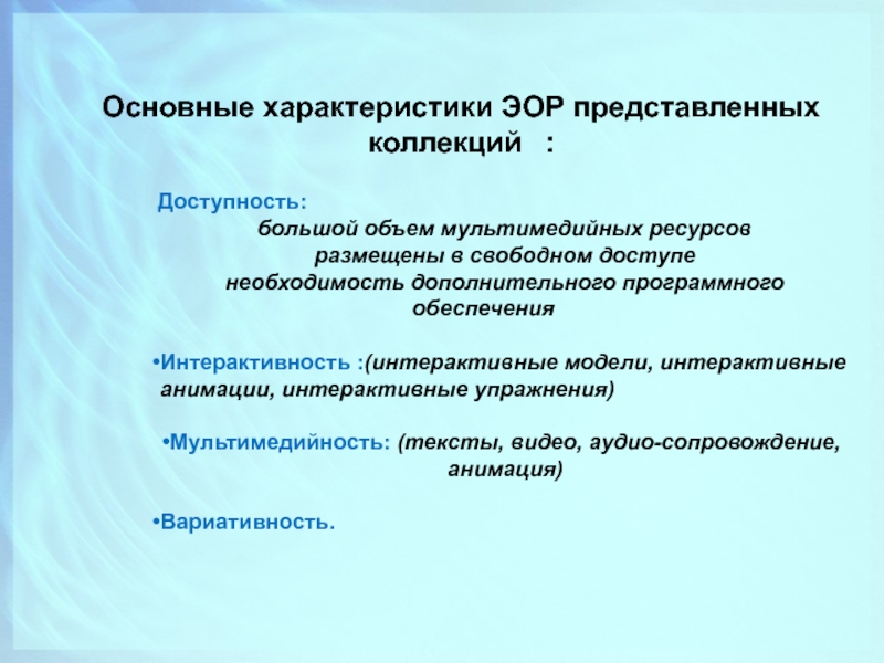 Слайд 25Основные характеристики ЭОР представленных коллекций :
