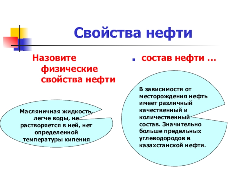 В зависимости от месторождения нефть имеет различный качественный и количественный состав. Значительно больше предельных углеводородов в казахстанской нефти.