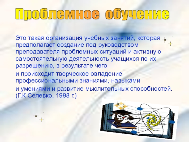 Это такая организация учебных занятий, которая предполагает создание под руководством преподавателя проблемных ситуаций и активную самостоятельную деятельность учащихся по их разрешению, в результате чего