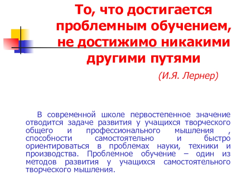 И.Я. Лернер считает, что «с педагогической точки зрения это такое обучение, при котором учащиеся систематически включаются в процесс решения проблем и проблемных задач».