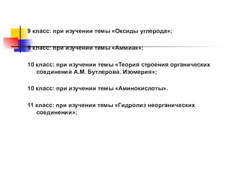 10 класс: при изучении темы «Теория строения органических соединений А.М. Бутлерова. Изомерия»;