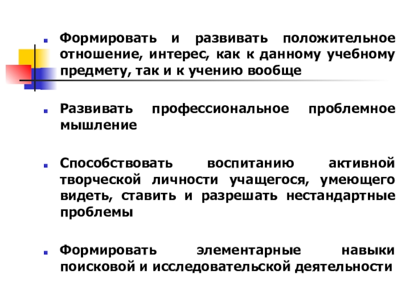 Способствовать воспитанию активной творческой личности учащегося, умеющего видеть, ставить и разрешать нестандартные проблемы