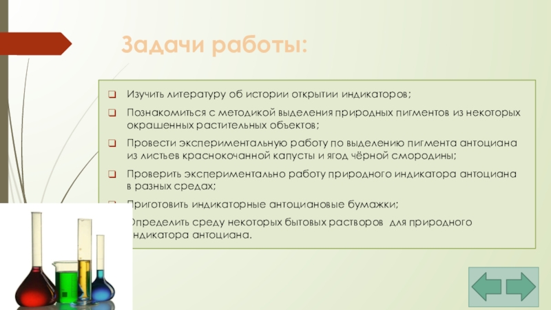 Проверить экспериментально работу природного индикатора антоциана в разных средах;