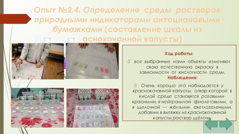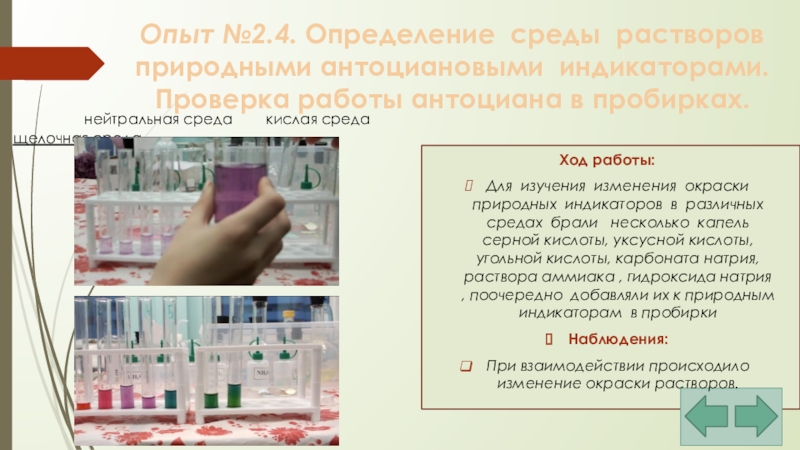 Слайд 31Опыт №2.4. Определение среды растворов природными антоциановыми индикаторами. Проверка работы