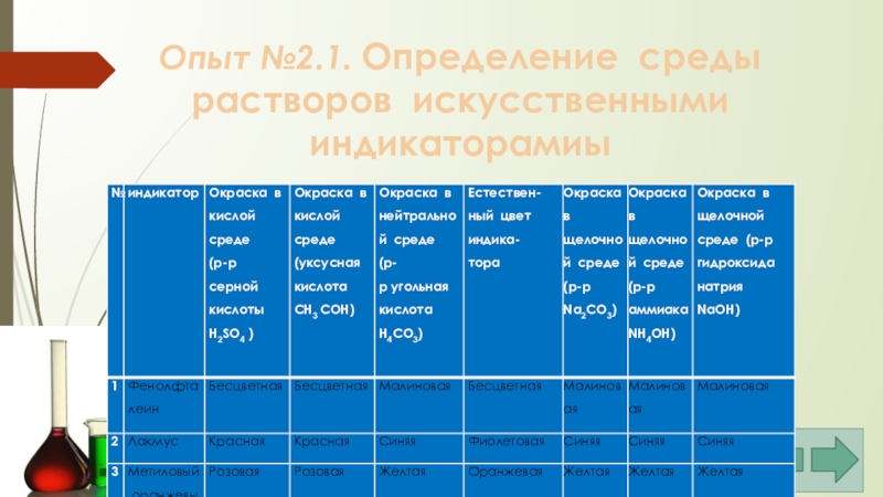 Слайд 28Опыт №2.1. Определение среды растворов искусственными индикаторамиы