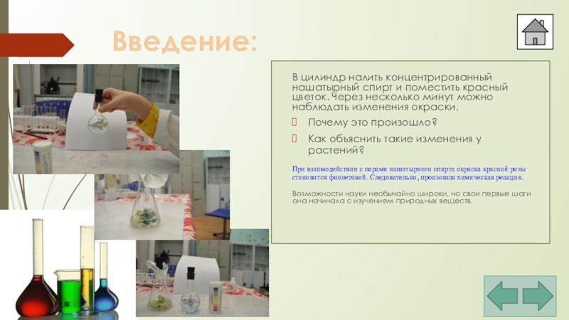 Для изучения изменения окраски природных индикаторов в различных средах брали несколько капель серной кислоты, уксусной кислоты, угольной кислоты, карбоната натрия, раствора аммиака , гидроксида натрия , поочередно добавляли их к природным индикаторам в пробирки