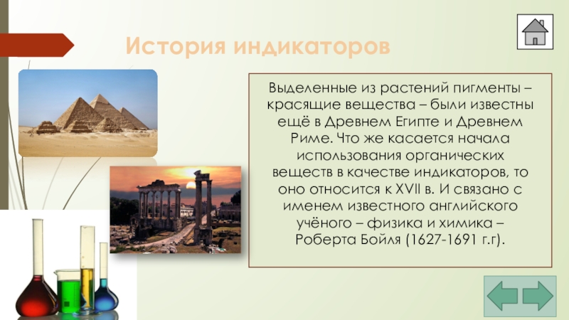 ещё в Древнем Египте и Древнем Риме. Что же касается начала использования органических веществ в качестве индикаторов, то оно относится к XVII в. И связано с именем известного английского учёного – физика и химика – Роберта Бойля (1627-1691 г.г).