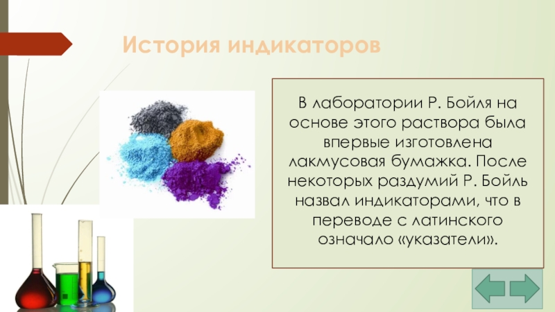 изготовлена лакмусовая бумажка. После некоторых раздумий Р. Бойль назвал индикаторами, что в переводе с латинского означало «указатели».