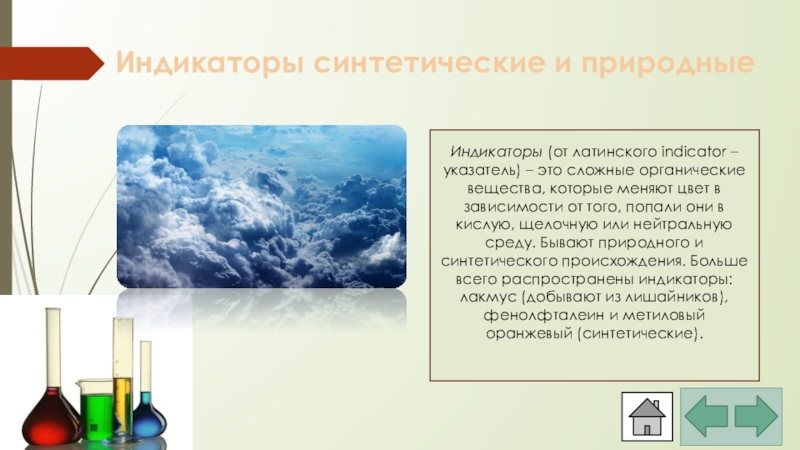 сложные органические вещества, которые меняют цвет в зависимости от того, попали они в кислую, щелочную или нейтральную среду. Бывают природного и синтетического происхождения. Больше всего распространены индикаторы: лакмус (добывают из лишайников), фенолфталеин и метиловый оранжевый (синтетические).