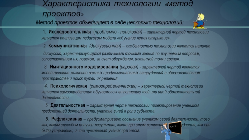 5. Деятельностная – характерная черта технологии проектирование учеником предстоящей деятельности, участие в ней в роли субъекта.
