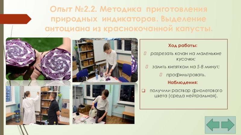 Слайд 29Опыт №2.2. Методика приготовления природных индикаторов. Выделение антоциана из краснокочанной капусты.