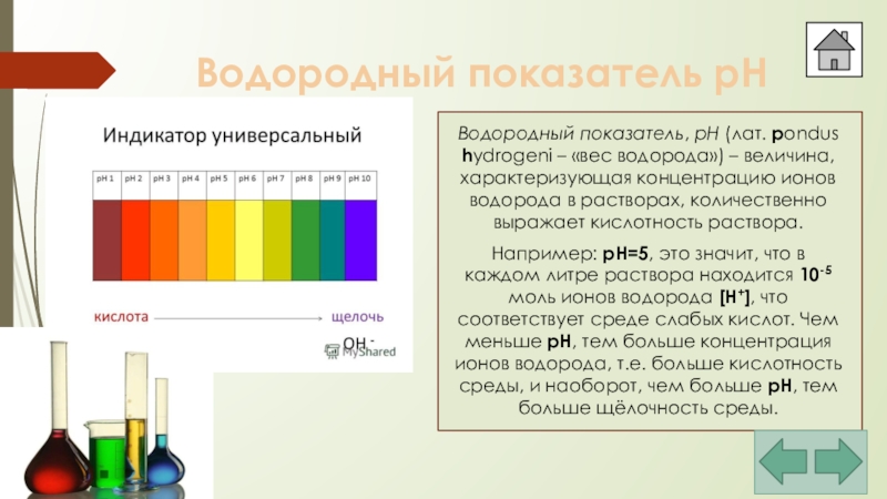Например: pH=5, это значит, что в каждом литре раствора находится 10-5 моль ионов водорода [H+], что соответствует среде слабых кислот. Чем меньше pH, тем больше концентрация ионов водорода, т.е. больше кислотность среды, и наоборот, чем больше pH, тем больше щёлочность среды.