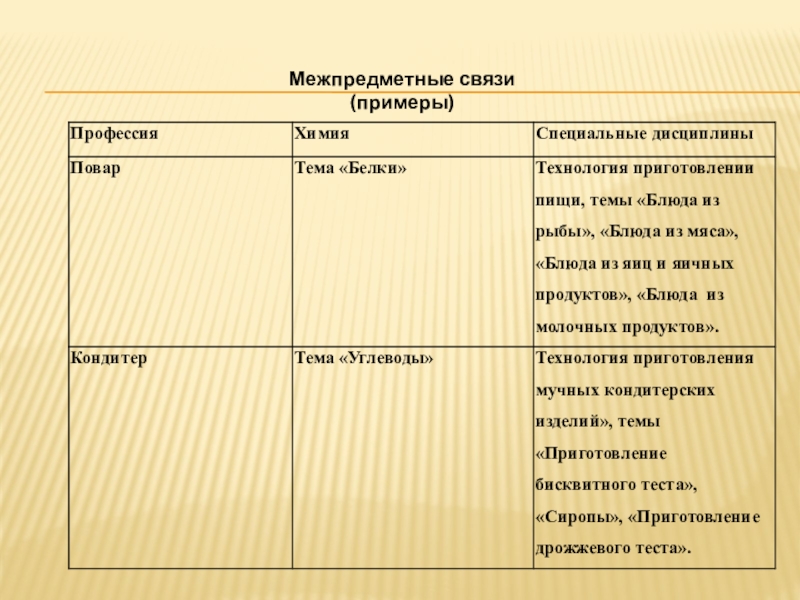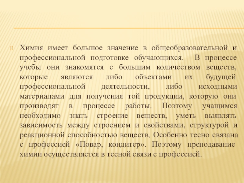 процессе учебы они знакомятся с большим количеством веществ, которые являются либо объектами их будущей профессиональной деятельности, либо исходными материалами для получения той продукции, которую они производят в процессе работы. Поэтому учащимся необходимо знать строение веществ, уметь выявлять зависимость между строением и свойствами, структурой и реакционной способностью веществ. Особенно тесно связана с профессией «Повар, кондитер». Поэтому преподавание химии осуществляется в тесной связи с профессией.