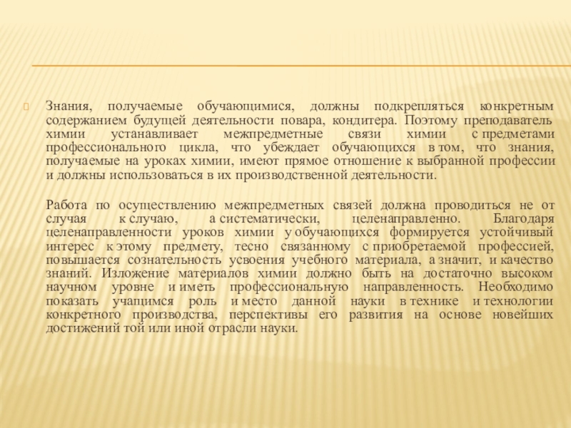 Работа по осуществлению межпредметных связей должна проводиться не от случая к случаю, а систематически, целенаправленно. Благодаря целенаправленности уроков химии у обучающихся формируется устойчивый интерес к этому предмету, тесно связанному с приобретаемой профессией, повышается сознательность усвоения учебного материала, а значит, и качество знаний. Изложение материалов химии должно быть на достаточно высоком научном уровне и иметь профессиональную направленность. Необходимо показать учащимся роль и место данной науки в технике и технологии конкретного производства, перспективы его развития на основе новейших достижений той или иной отрасли науки.