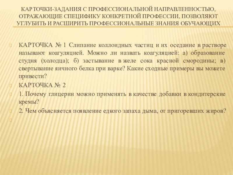 Слайд 12карточки-задания с профессиональной направленностью, отражающие специфику конкретной профессии, позволяют углубить и расширить профессиональные
