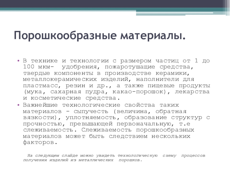 Важнейшие технологические свойства таких материалов - сыпучесть (величина, обратная вязкости), уплотняемость, образование структур с прочностью, превышающей первоначальную, т.е слеживаемость. Слеживаемость порошкообразных материалов может быть следствием нескольких факторов.