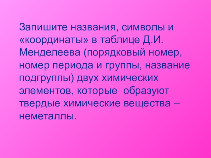 Запишите названия, символы и «координаты» в таблице Д.И. Менделеева (порядковый номер, номер периода и группы,