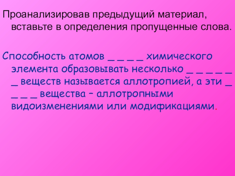 _ _ химического элемента образовывать несколько _ _ _ _ _ _ веществ называется аллотропией, а эти _ _ _ _ вещества – аллотропными видоизменениями или модификациями.