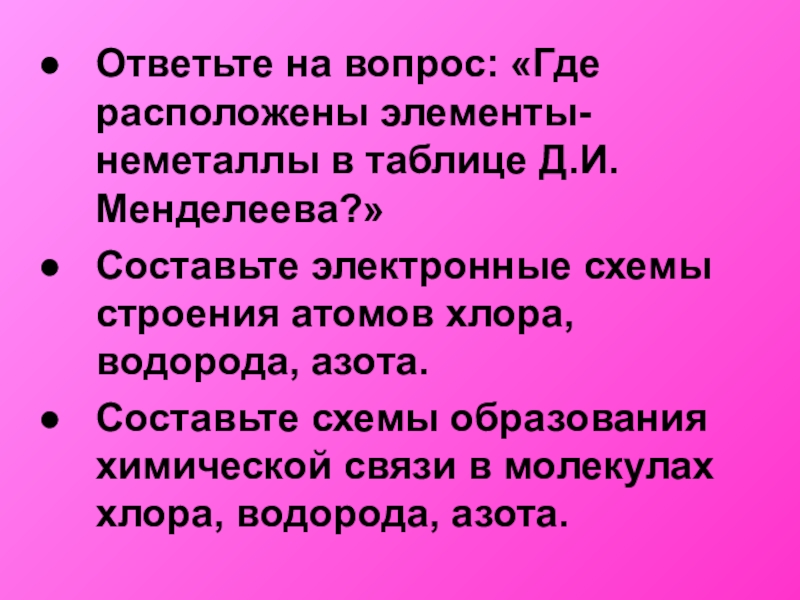 Ответьте на вопрос: «Где расположены элементы-неметаллы в таблице Д.И. Менделеева?»Составьте электронные схемы строения атомов хлора, водорода, азота.Составьте схемы образования химической связи в молекулах хлора, водорода, азота.