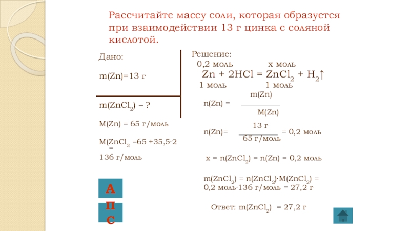 Рассчитайте массу соли, которая образуется при взаимодействии 13 г цинка с соляной кислотой.