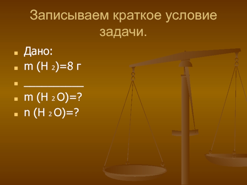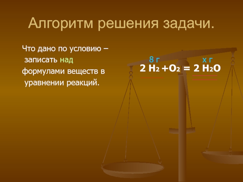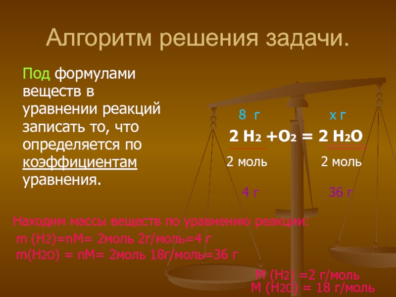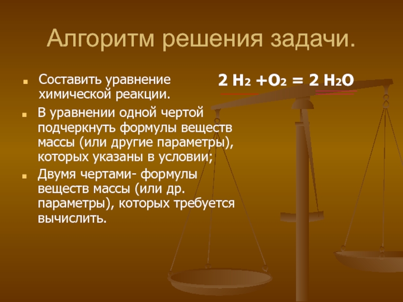 В уравнении одной чертой подчеркнуть формулы веществ массы (или другие параметры), которых указаны в условии;