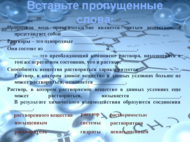 Ненасыщенным называют такой раствор, в котором при данной температуре находится меньше растворяемого вещества, чем в его насыщенном растворе.