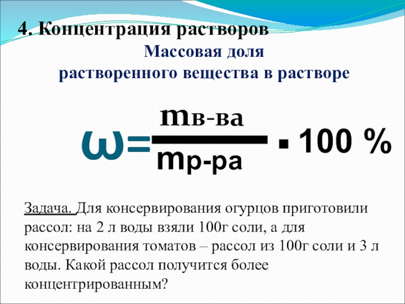 Задача. Для консервирования огурцов приготовили рассол: на 2 л воды взяли 100г соли, а для консервирования томатов – рассол из 100г соли и 3 л воды. Какой рассол получится более концентрированным?