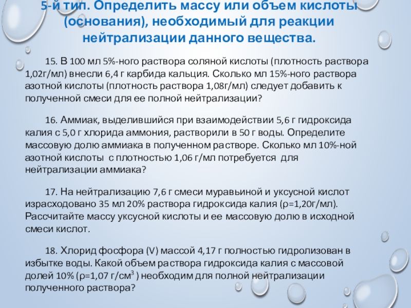 Слайд 295-й тип. Определить массу или объем кислоты (основания), необходимый для реакции