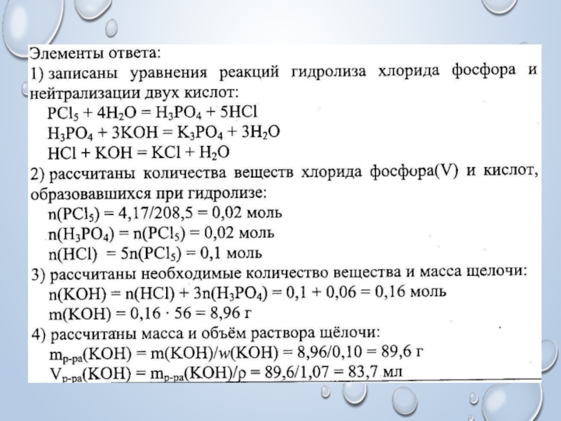 18. Хлорид фосфора (V) массой 4,17 г полностью гидролизован в избытке воды. Какой объем раствора гидроксида калия с массовой долей 10% (ρ=1,07 г/см3 ) необходим для полной нейтрализации полученного раствора?