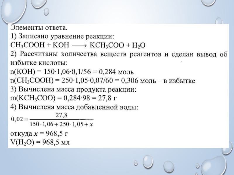 8. Смешали 250 мл 7%-ного раствора уксуса (p=1,05г/мл) и 150 мл 10%-ного раствора гидроксида калия (p=1,06 г/мл). Сколько миллилитров воды следует добавить к полученной смеси, чтоб массовая доля ацетата калия в ней составила бы 2%.