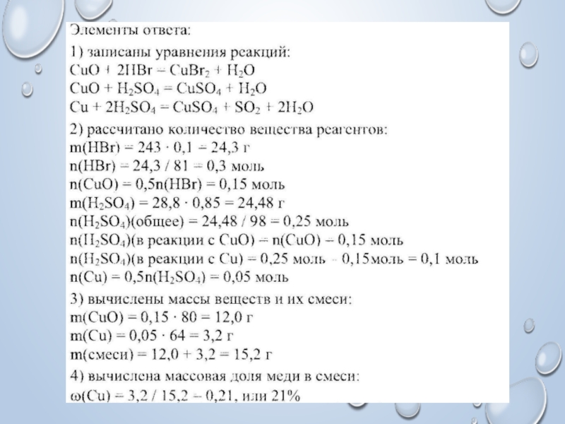21. Смесь меди и оксида меди (II) может прореагировать с 243 г 10%-ного раствора бромоводородной кислоты, или 28,8 г 85%-ного раствора серной кислоты. Определите массовую долю меди в смеси.